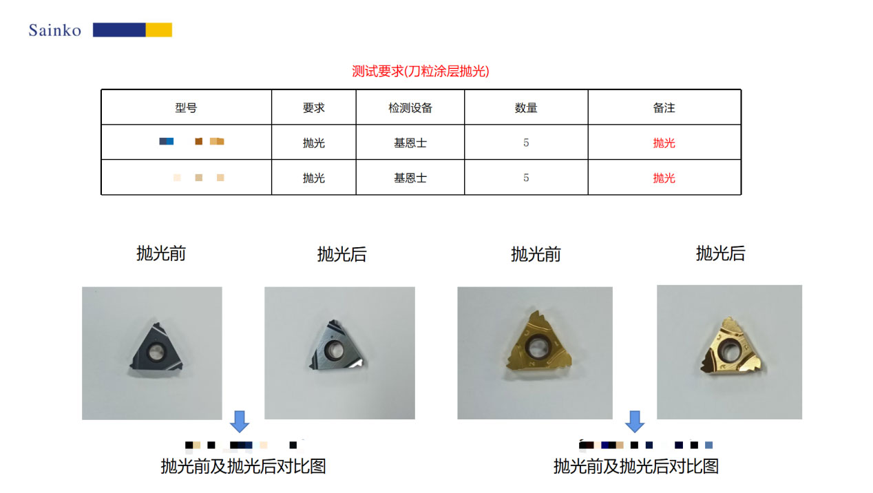 本次測試樣品為客戶提供的兩款刀粒,各5件,核心需求為涂層拋光處理。我司采用PL-12C設(shè)備及15000-L型號磨料進(jìn)行加工,實現(xiàn)了涂層表面液滴去除,有效提升了產(chǎn)品表面質(zhì)量。具體測試結(jié)果詳見本報告。