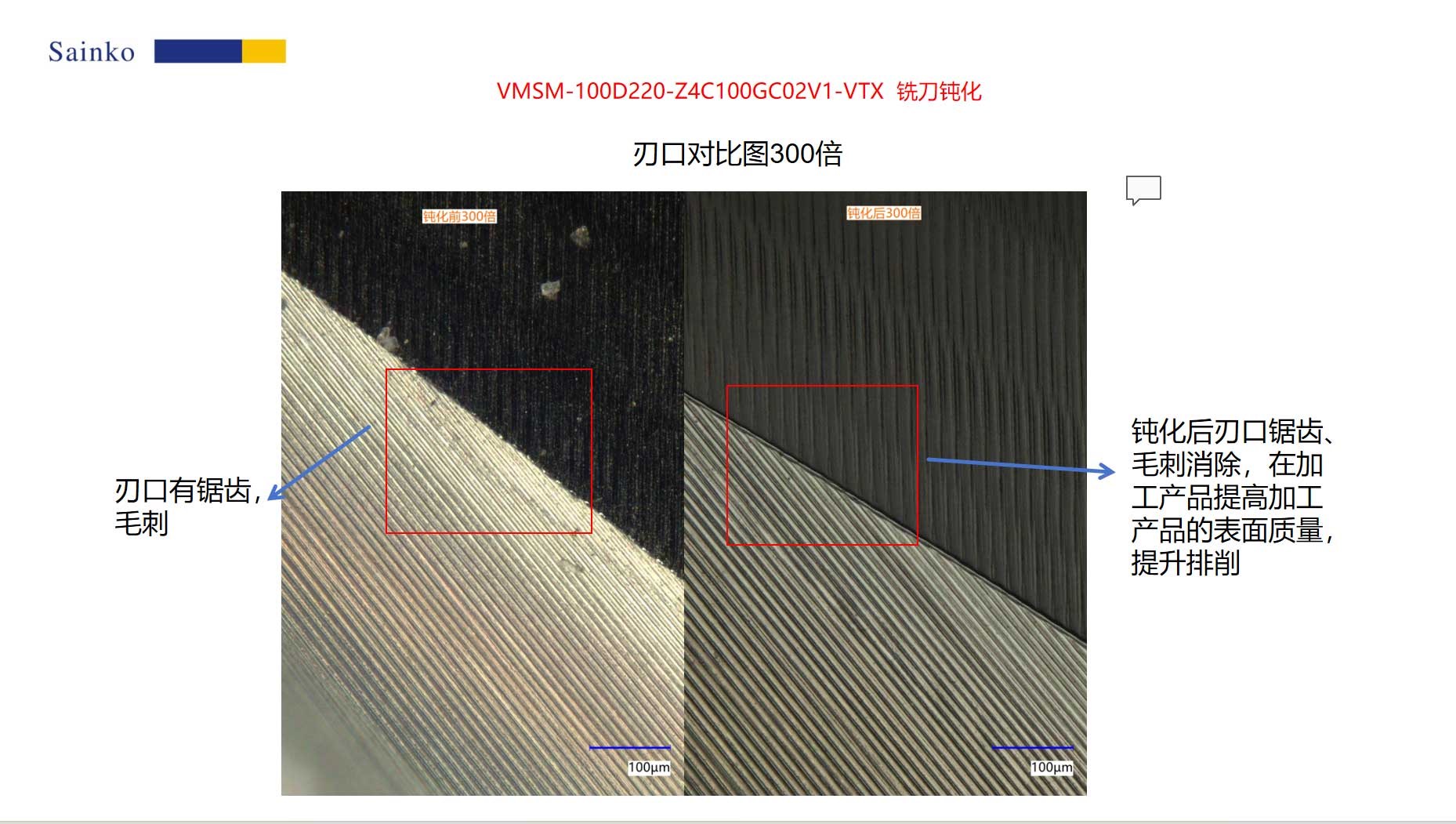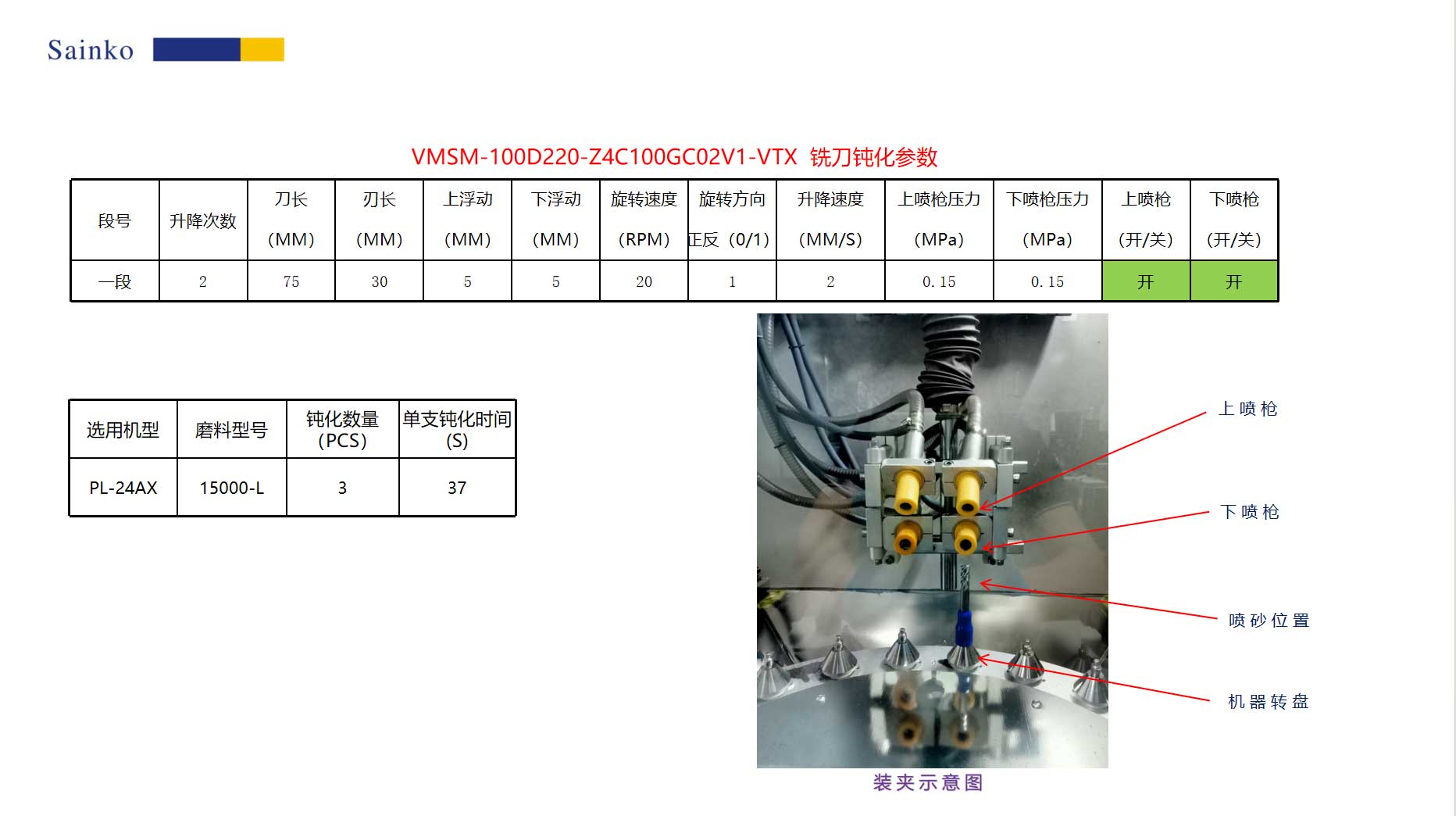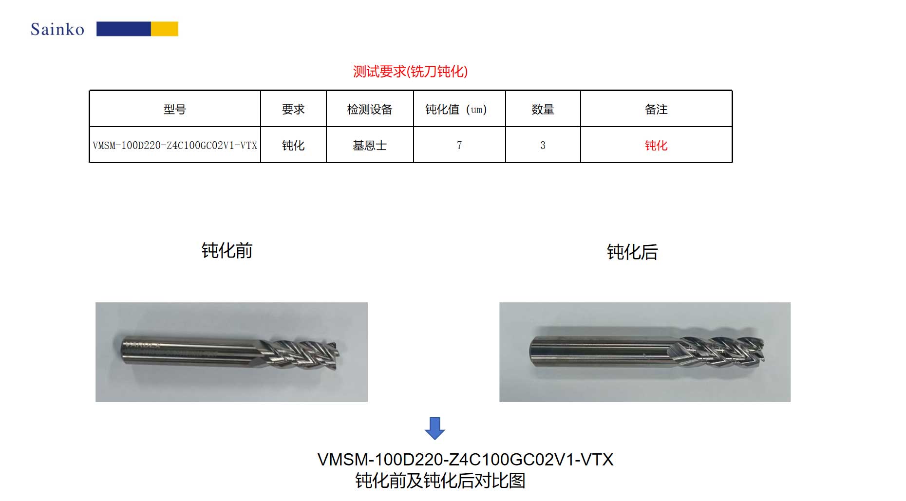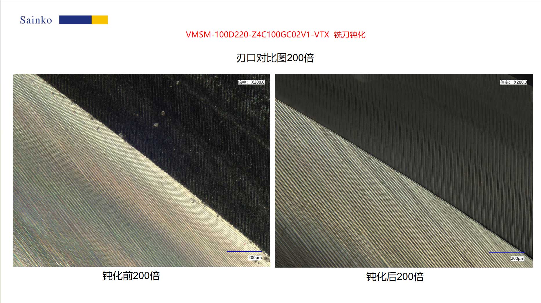 本次測試樣品為客戶提供的銑刀,型號(hào)為VMSM-100D220-Z4C100GC02V1-VTX,共計(jì) 3 件,核心需求為銑刀鈍化處理,且明確鈍化值需達(dá)到 7μm 標(biāo)準(zhǔn)。為精準(zhǔn)滿足需求,我司采用PL-24AX鈍化設(shè)備,并搭配15000-L型號(hào)磨料開展加工:通過設(shè)備對(duì)鈍化轉(zhuǎn)速、壓力等參數(shù)的精準(zhǔn)調(diào)控,結(jié)合磨料的精細(xì)研磨作用,終 3 件銑刀的鈍化值均穩(wěn)定達(dá)到 7μm 預(yù)設(shè)要求,同時(shí)消除了刃口原始存在的鋸齒與毛刺。經(jīng)后續(xù)驗(yàn)證,鈍化后的銑刀在切削加工過程中,不僅能顯著提高加工產(chǎn)品的表面質(zhì)量,還優(yōu)化了切屑排出效果,有效減少切屑堆積、劃傷工件的問題,具體測試結(jié)果詳見本報(bào)告。