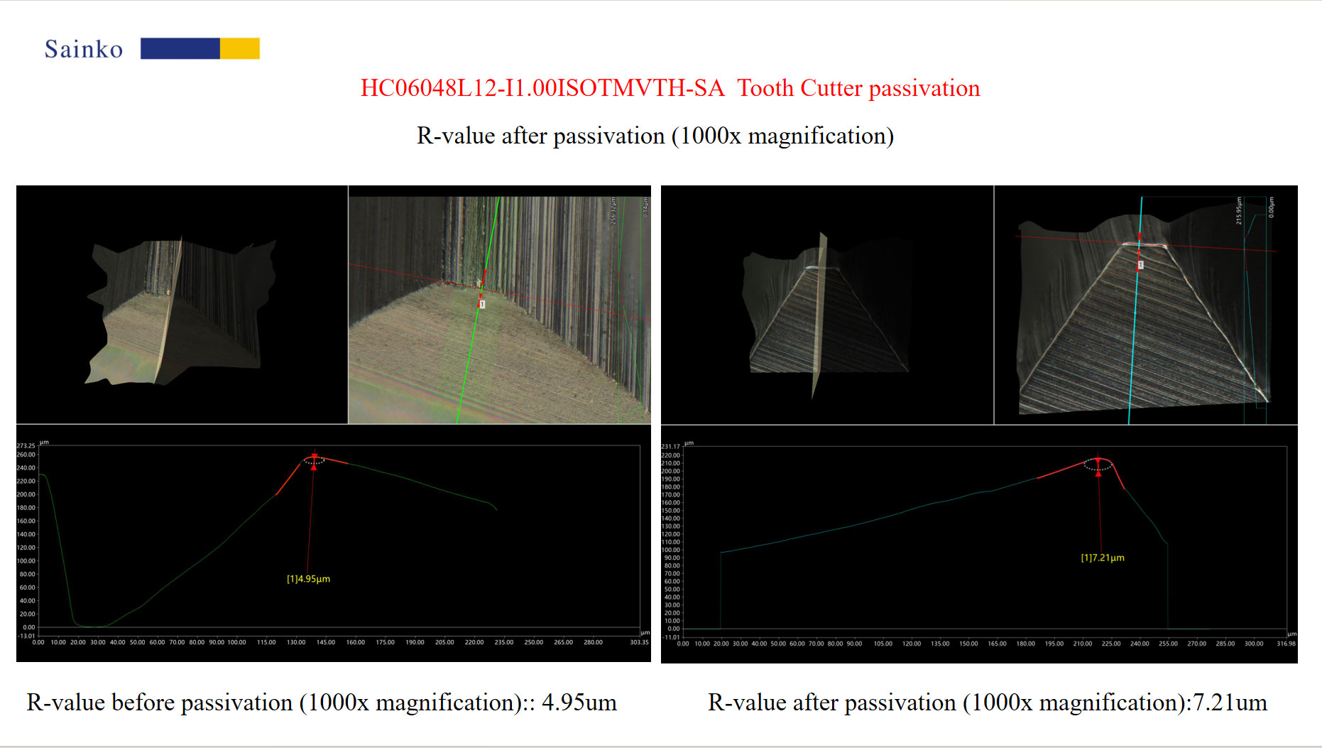By comparative observation, it can be seen that there are obvious small serrations and burrs on the cutting edge before passivation, and the cutting edge is irregular, which can easily cause problems such as high cutting resistance and poor surface roughness; After passivation, the blade is flat and smooth, with a uniform and rounded shape, and no residual burrs. This improvement effectively enhances the surface quality of processed products, optimizes the chip discharge effect, and significantly reduces the risk of chip accumulation and workpiece scratches.
