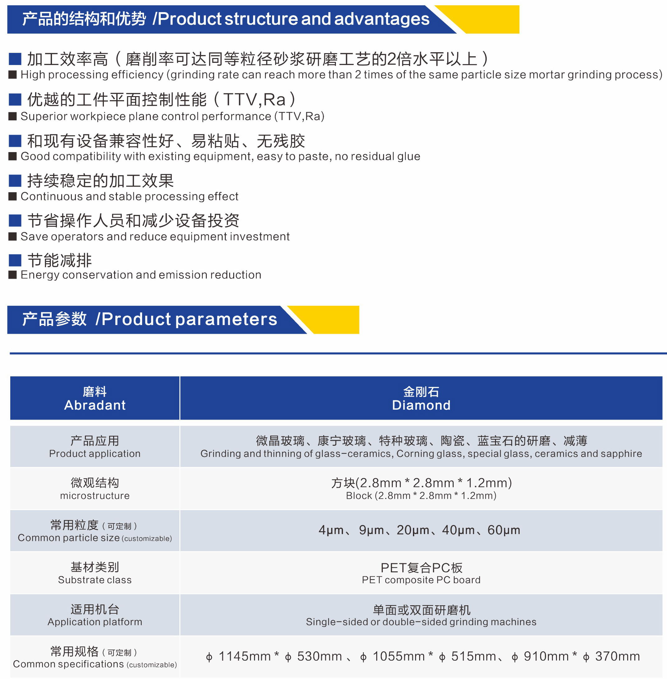 圣高鉆石研磨墊是電子精密研磨的[敏感詞]解決方案,目前普遍使用的5種類型,根據(jù)粒徑分為4mic、9mic、20mic、40mic、60mic(可定制),主要應(yīng)用于微晶玻璃、康寧玻璃、手機(jī)玻璃蓋板減薄,攝像頭保護(hù)后蓋減薄,光學(xué)平面玻璃,藍(lán)寶石窗口片,碳化硅半導(dǎo)體片,陶瓷片,以及各種混合產(chǎn)品的冷加工,研磨減薄。